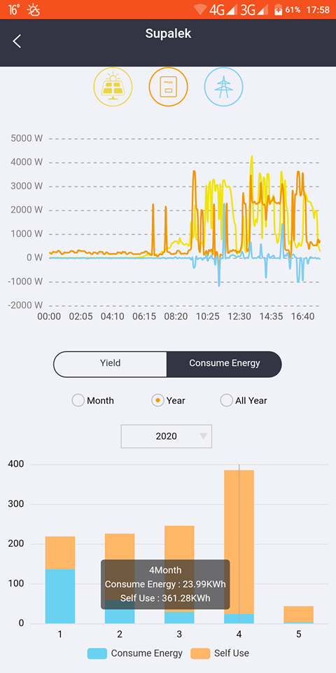 Ukázka jak může fungovat FVE s baterií na rodinném domě. Jedná se o jednofázové řešení fotovoltaické elektrárny připojené k síti 7.1.2020. Reálně bude rodinný dům takřka soběstačný na el. energii, když budou příznivé podmínky až do konce září. V tomto konkrétním případě se jedna o FVE s 12 ks panelů o výkonu 3,6 kW, 2 ks baterie Triple Power LiFePO4 HV 6,3 kWh. Instalován zásobník TUV o objemu 120 l vody jako předehřev stávajícího plynového bojleru.